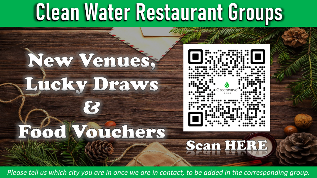 To participate, you only need to: 要参与这个活动,您只需要: – Post a meaningful comment at the end of this article on how you enjoyed the CWR experience and what it brought to you in 2023 (minimum 50 words).– Share this article on your WeChat moments (visible to everyone until January 5th minimum) with the caption: “I loved Clean Water Restaurants in 2023, you will love them in 2024!” – Send us a screenshot of both before January 5th, 2024 (contact QR code below).-在文章末尾发表一篇有意义的评论,分享一下您在纯净水餐厅用餐的体验,以及它在2023年给您带来了什么(至少50字)。 -在您的微信朋友圈分享这篇文章(请设置为所有人可见,保留至2024年1月5日),并配文:”I loved Clean Water Restaurants in 2023, you will love them in 2024!” -在2024年1月5日前将评论截图和朋友圈截图发送给我们。(扫描上方的二维码加入群组)