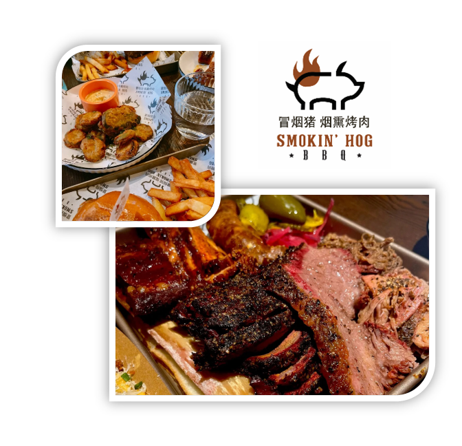 冒烟猪SmokinHog美式烟熏烤肉(上海同乐坊店)位于静安区同乐坊,工业风设计搭配开放式厨房,可观赏果木烟熏过程。主打12小时慢烤猪肋排、德州牛胸肉及烟熏芝士通心粉,柴火薯条配秘制酱料。20余款精酿啤酒墙,大面积好看喷绘墙,烘托出美式氛围。